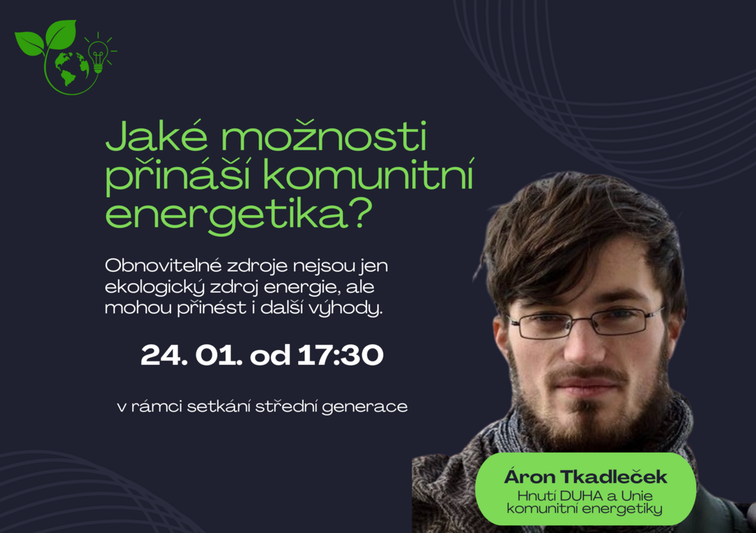 Téma Komunitní energetiky přednese v rámci střední generace Áron Tkadleček, specialista v ekologické organizaci Hnutí DUHA a Unii komunitní energetiky.