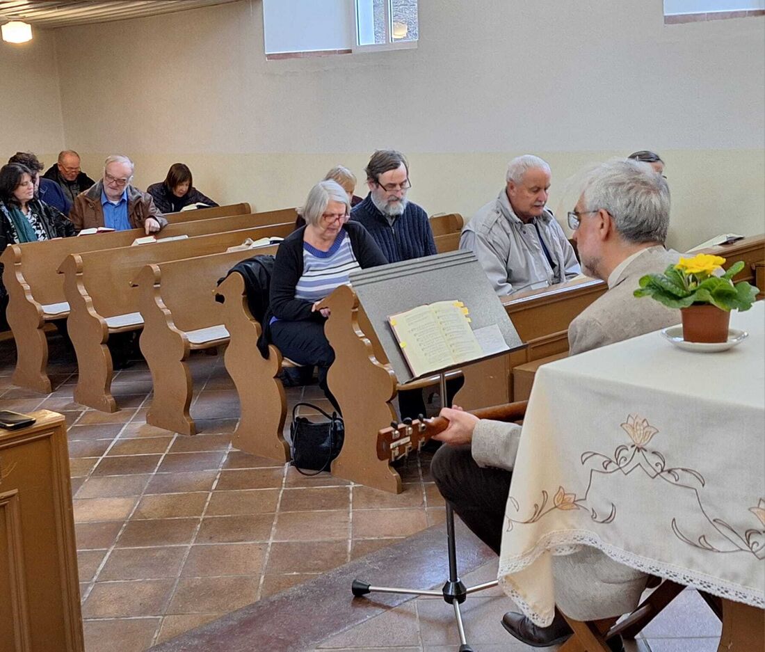 Po obědě se účastníci konference věnovali ještě společnému zpěvu málo známých písní z nového evangelického zpěvníku. Pod vedením Jiřího Schneidera, který je také církevním kantorem a autorem několika písňových doprovodů v novém chorálníku, jsme zvládli některé písně zazpívat ve čtyřhlasé úpravě. Kromě dobrého vedení br. kantora k tomu pomohla i akustika libštátského kostela, a hlavně nadšený sbor účastníků konference /foto č. 5, 6 a 7/.